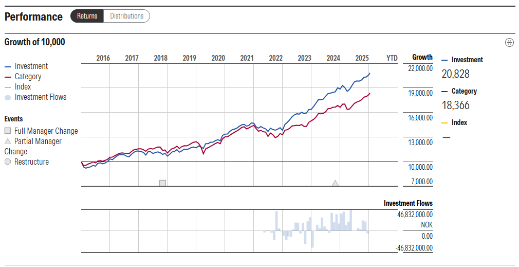 Grafen fra Morningstar viser FDAs relative utvikling mot gjennomsnittet av fond i samme kategori.