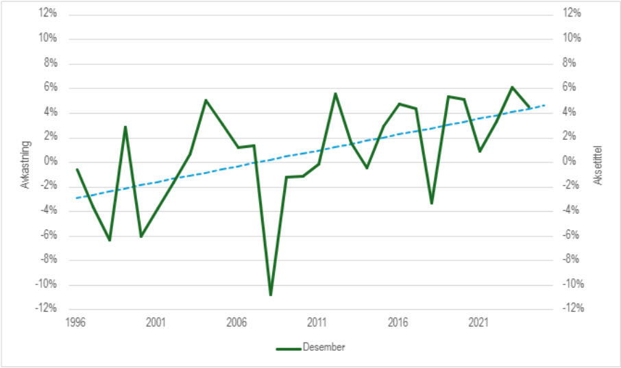 Interessant nok ser man motsatt trend for desember, nemlig at den positive sesongeffekten for desember for de mindre selskapene er stigende på lang sikt, og at desembereffekten også har vært gjeldende alle de foregående fem årene (se graf under).