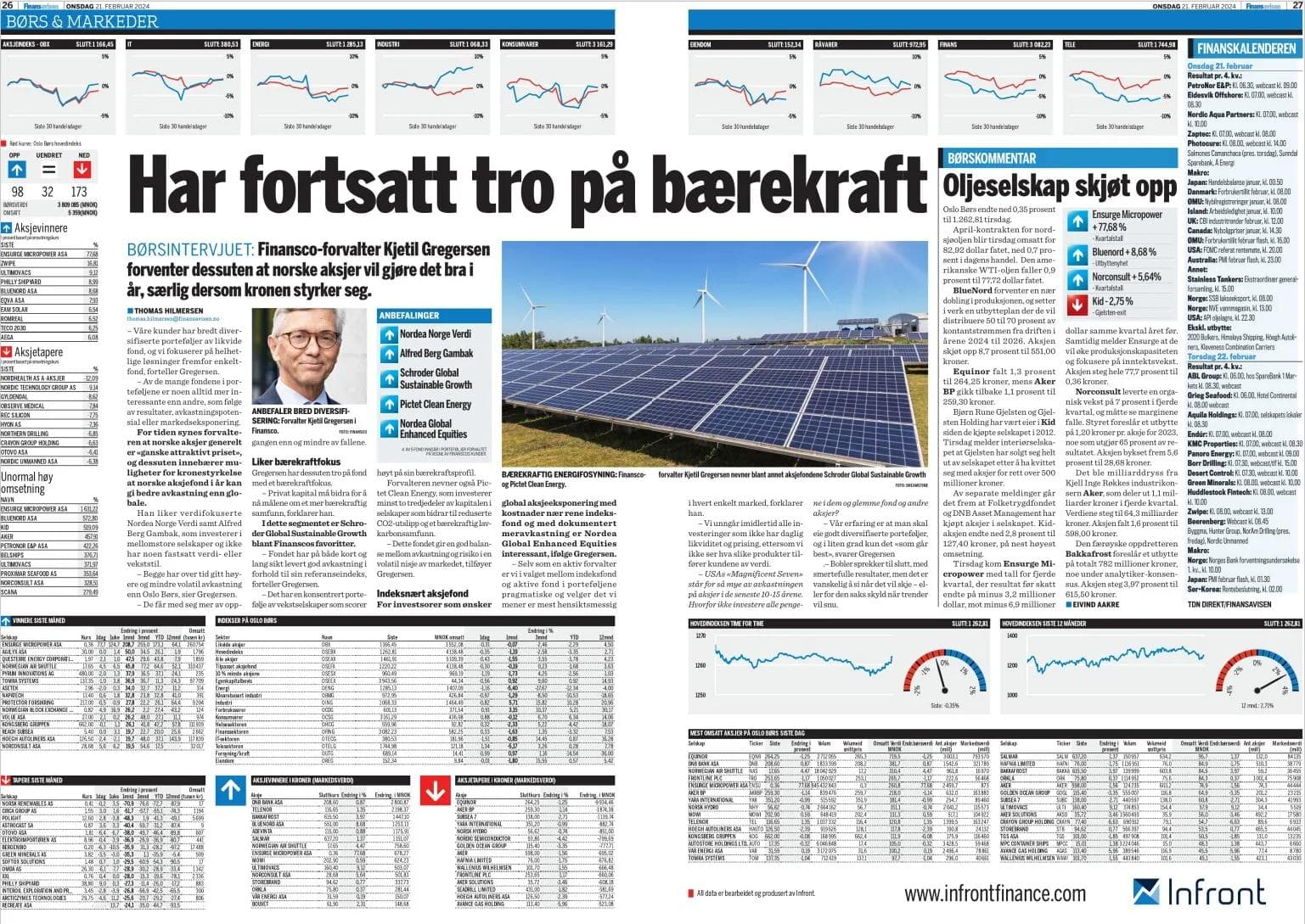 Finansco-forvalter Kjetil Gregersen har fortsatt tro på bærekraft, og forventer også at norske aksjer vil gjøre det bra i år, særlig dersom kronen styrker seg. Finansavisen, 20. februar.