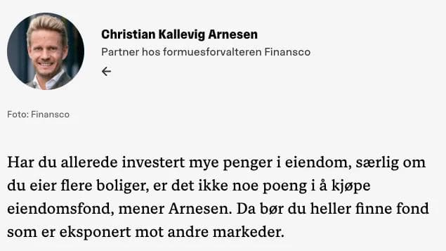 Har du allerede investert mye penger i eiendom, særlig om du eier flere boliger, er det ikke noe poeng i å kjøpe eiendomsfond, mener Arnesen. Da bør du heller finne fond som er eksponert mot andre markeder.