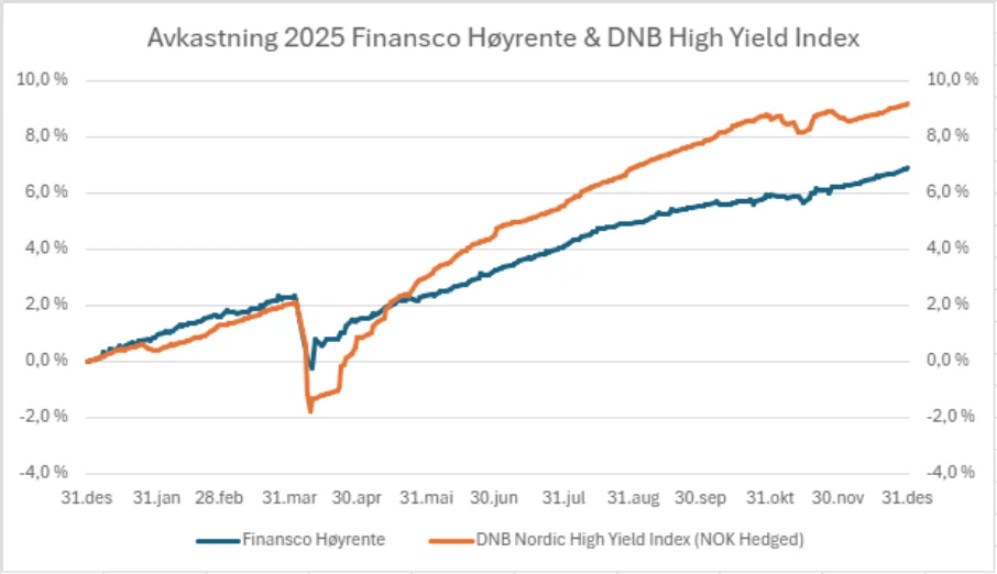 Grafen viser Finansco Høyrente mot DNB High Yield Index i 2025