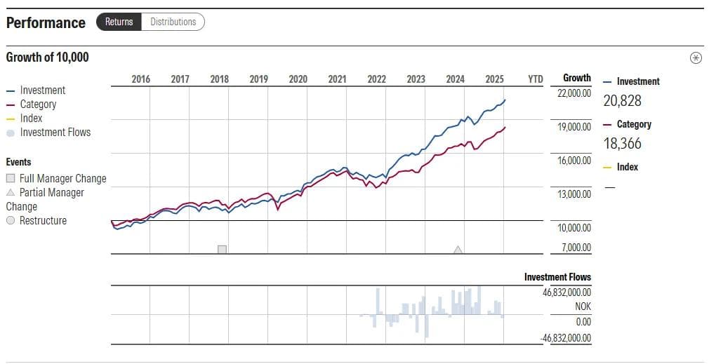 Grafen fra Morningstar viser FDAs relative utvikling mot gjennomsnittet av fond i samme kategori.
