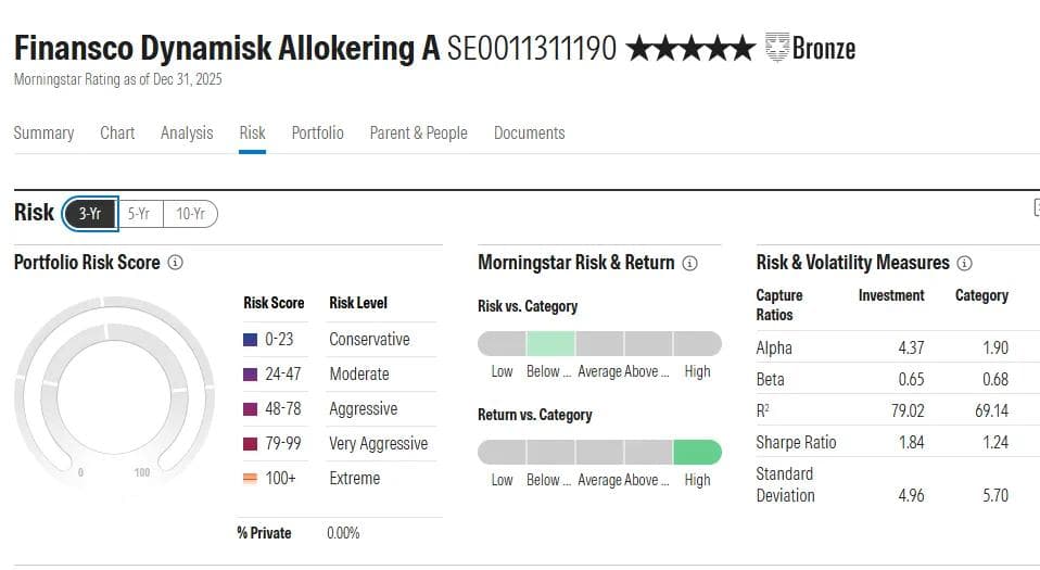 At Finansco Dynamisk Allokering oppnår høyere avkastning til lavere risiko enn banker og øvrige forvalteres fond i samme kategori, er en bekreftelse på at strategien fungerer (lenke til Morningstar). Les mer ved å følge denne lenken.