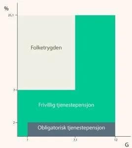 Minimum av det du må spare for ansatte er regulert i lov om obligatorisk innskuddspensjon. Som du ser av grafen under er bedriften pålagt å spare minimum to prosent av lønnen mellom 1 og 12 G. Her er G folketrygdens grunnbeløp som er 93 634 kroner, så du skal spare for lønn mellom 93 634 og 1 123 608 kroner. Det er frivillig å spare fra 0 til 1 G, og du kan øke sparesatsene som er vist i under.