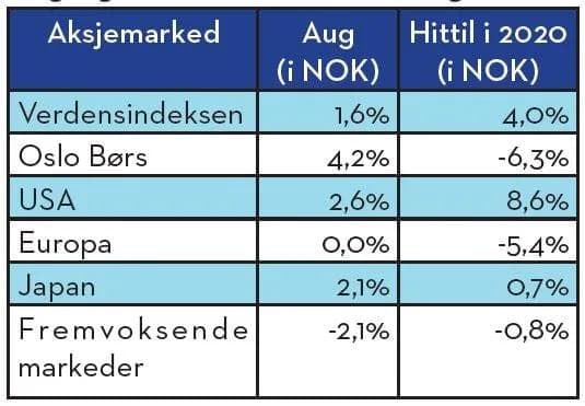 I lokal valuta i august var Japan best og fremvoksende markeder svakest, med en oppgang på hhv. 7,95% og 2,25%. Det ble enda en måned med styrking av NOK, og derfor forsvant en del av oppgangen i lokal valuta. Målt i NOK gav Oslo Børs best avkastning med 4% og fremvoksende markeder, som i juli var best, i august svakest med en nedgang på 2%. Hittil i år i lokal valuta er gapet stort mellom beste og dårligste marked, USA er opp nærmere 10% mens Europa er ned 10%.