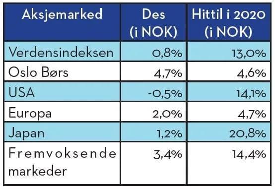 Oppgangen i november fortsatte inn i desember for de fleste aksjemarkedene. I lokal valuta var oppgangen mellom 2% og 7%, hvor fremvoksende markeder var best og Europa svakest. Også Oslo Børs hadde bra oppgang.