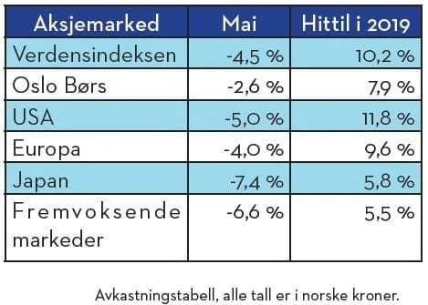 Etter fire strake måneder med sterk oppgang i aksjemarkedene, fikk vi et solid fall i markedene i mai. «Sell in May and stay away» ser fortsatt ut til å gjelde så langt. Den utløsende faktor var at markedets forventning om at en handelsavtale mellom Kina og USA var i ferd med å komme på plass, ble grundig torpedert. Retorikken fra begge parter har hardnet betydelig gjennom mai og frykten i markedet er økende om at konflikten kan både bli verre og mer langvarig. Skjer dette, er sannsynligheten for lavere global vekst og svakere utvikling i aksjemarkedene betydelig.
