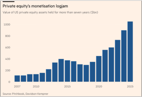 Grafen over viser verdien av selskaper som PE-fondene har hatt i sitt eie i over 7 år, og som de ikke får solgt. Det hoper seg opp med overvurderte selskaper, noe som igjen medfører stadig mer kreative varianter.