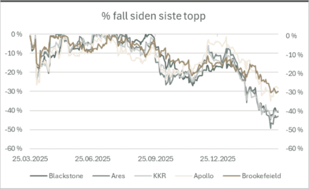 Grafen over viser aksjekursutviklingen til fem av de aller største børsnoterte Private Equity-forvalterne (“PE”) siste ett år. Boblen har sprukket, og disse opplever verdifall i størrelsesorden 30-50 prosent.