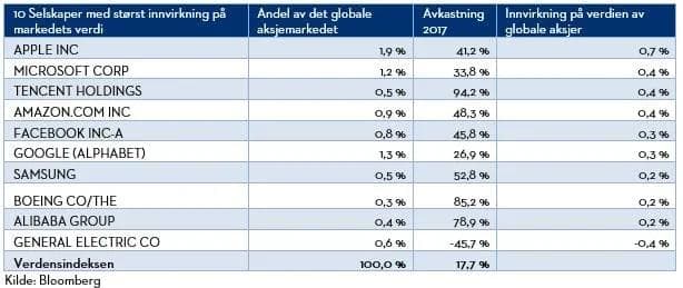 Blant de 10 selskapene som hadde størst innvirkning på verdiutviklingen av det globale markedet finner vi disse syv IT-gigantene. Til sammen stod de syv IT-gigantene for 2,7 % av markedets totale avkastning på 17,7 %. Av de 10 selskapene med størst innvirkning var det bare ett selskap som falt i verdi. General Electric er, eller rettere sagt var, et av verdens største selskaper, men falt 46 % i 2017. Krisen i GE alene reduserte verdien av det globale aksjemarkedet med 0,4 %.
