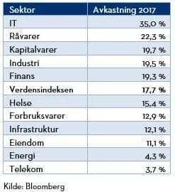 Deler vi aksjemarkedet inn i sektorer ser vi en betydelig større spredning i avkastningen enn da vi så på regioner. IT-sektoren har gitt desidert best avkastning, og steg 35 % i 2017. Selv om svingningene i markedet var rekordlave, og lite skilte mellom ulike regioner, var fordeling på sektorer avgjørende for avkastningen. Uten IT-selskaper i portefølje ville avkastning blitt langt svakere, og var porteføljen konsentrert i energi- og telekomsektorene fremstod ikke 2017 som et jubelår.