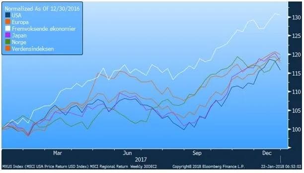 Ser vi på de store regionale markedene var det lite som skilte på avkastning i 2017. Amerikanske aksjer steg knappe 16 % og europeiske aksjer steg 20 %. Oslo Børs, Japan og Verdensindeksen havnet et sted imellom. Hvor i den vestlige verden man plasserte pengene hadde relativt lite å si for avkastningen. Fremvoksende økonomier var imidlertid et unntak og skilte seg ut på den positive siden ved å stige over 30 %, og var man investert i Asia gikk det enda bedre.