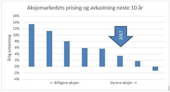 Grafen baserer seg på data fra det amerikanske aksjemarkedet de siste 150 årene, og viser sammenhengen med prisingen på tidspunktet for investering, og den årlige avkastningen de 10 påfølgende årene. Billige aksjer har gitt en årlig avkastning på over 10 %, og dyre aksjer 2 % – 6 %. Det er kun investorer som kjøpte på toppen av IT-boblen i 1999/2000 som har opplevd negativ avkastning i en 10-års periode.