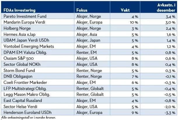 I desember var det norske og europeiske aksjer som ga den beste avkastningen. Amerikanske dollar svekket seg en del i verdi, og trakk avkastningen i Sector Helse Verdi og Henderson Euroland USDh (europeiske aksjer valutasikret til USD) ned. Oljeprisen har holdt seg sterk og det er et positivt sentiment i fremvoksende økonomier. Da er det litt overraskende å se at East Capital Russland ligger langt nede på avkastningstabellen.