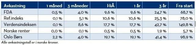 Gjennom året varierte andelen aksjer i porteføljen mellom drøye 50 % og 80 %. Andelen høyrenteobligasjoner varierte mellom 5 % og 10 %, og investeringer i alternative rentefond gikk fra 0 % til 15 % i løpet av året. Denne dynamiske tilnærmingen til hva vi investerer i er en sentral del av vår forvaltning. Dynamikken er det som skiller FDA fra de fleste andre kombinasjonsfondene.