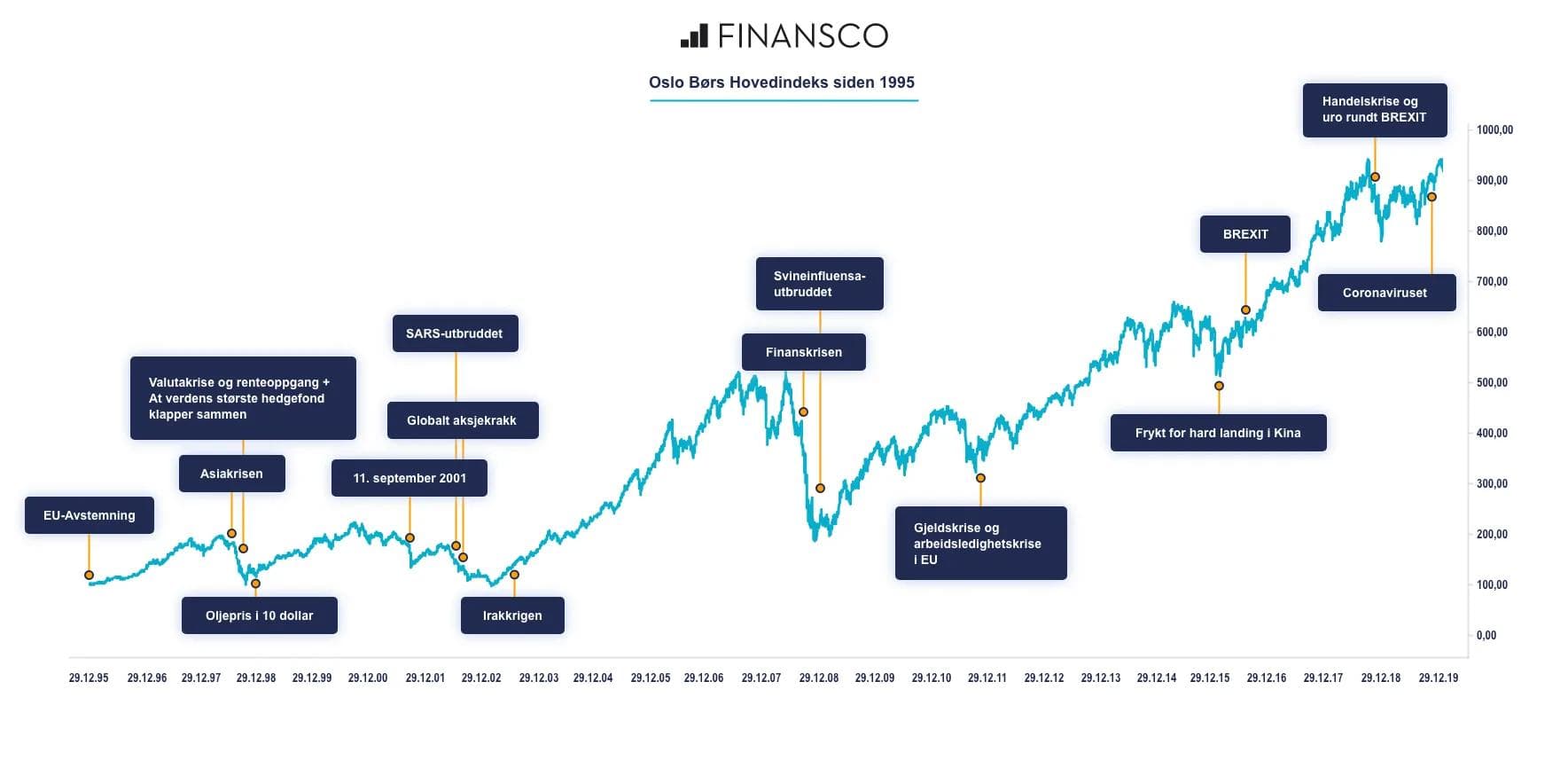 Mange har en oppfatning om at fondssparing innebærer stor risiko for å tape alle pengene du investerer. Det vil vi ikke si. Tar du en titt på grafen under, ser du at aksjemarkedet har hatt mange opp- og nedturer underveis, men på 20 år har det altså likevel gått opp flere hundre prosent.