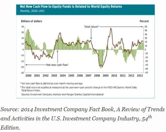 Finnes det noen dokumentasjon på hvor god den jevne fondsinvestor er på å time sine faktiske investeringer? Slik dokumentasjon er faktisk tilgjengelig. Før jeg går gjennom denne dokumentasjonen, viser jeg grafen under. Den illustrerer hvordan kapitalen går inn og ut av aksjemarkedet i oppgangs- og nedgangstider, og her finner vi et tydelig mønster. Vi kan se hvordan kapital trekkes ut i negative markeder og kommer inn igjen i stigende.