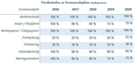 Formuen beregnes i utgangspunktet til omsetningsverdi/markedsverdi, men det er ulike verdsettelsesregler for ulike formuesobjekter. Formuesobjekter kan være bolig, hytte, bankinnskudd, aksjer, etc. De seneste årene har verdsettelsesrabattene på «arbeidende kapital» økt, som betyr at aksjer, aksjefond og driftsmidler får en lavere verdi når formuen skal beregnes. Det er dog kun marginale endringer fra i fjor.