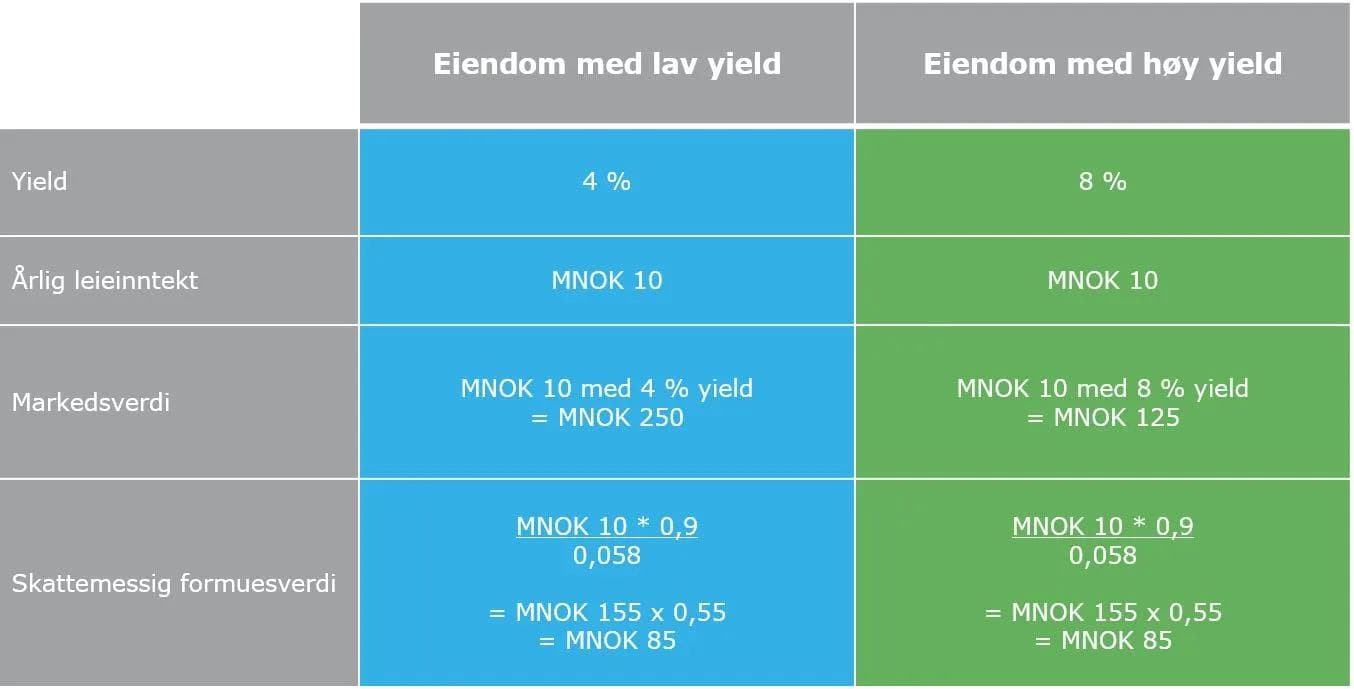 Eiendommer med høy yield får en tilsvarende høy formuesverdi i forhold til markedsverdi. For næringseiendom som har en høyere sjablongmessig formuesverdi enn markedsverdi, kan formuesverdien kreves nedsatt etter takst.