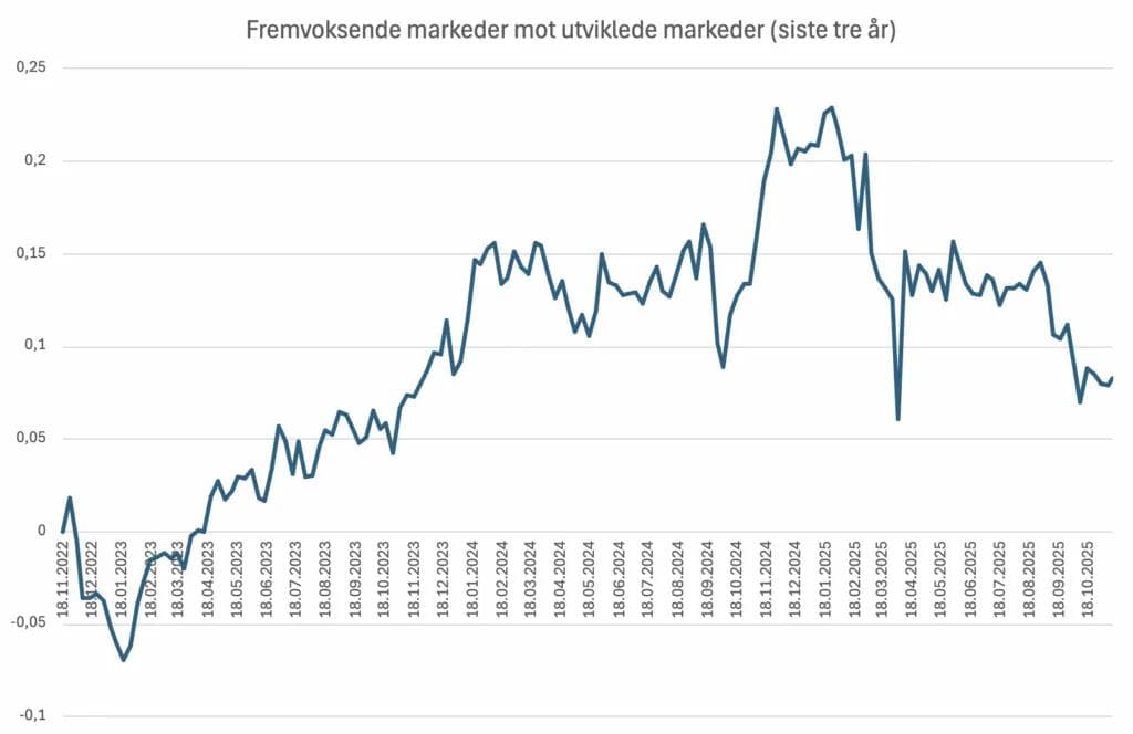 Etter flere år med svakere utvikling enn modne markeder, har fremvoksende markeder (EM) endelig fått medvind igjen. I 2025 har EM gjort et tydelig comeback, og oktober ble en ny sterk måned, med oppgang på 4,6 prosent i lokal valuta og 5,6 prosent målt i norske kroner.