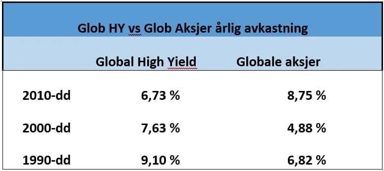 Perioden fra 2010 og frem til 2020 reflekterer vel i større grad avkastning som følge av kredittrisikopremie i høyrentemarkedet i forhold til globale aksjer. I denne perioden har globale aksjer gitt ca. 5 % årlig mot 4,5 % for globale høyrenteobligasjoner. Risikojusterer vi avkastningen for begge, kommer faktisk høyrentemarkedet fortsatt best ut, og dette mener jeg er en riktigere måte å se det på.