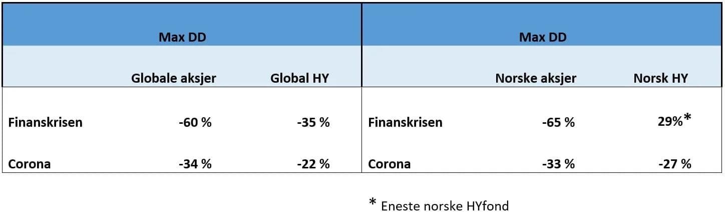 Tabellen under viser som et eksempel hvor mye globale aksjer og høyrente falt fra topp til bunn under henholdsvis Finanskrisen og tidligere i år under starten på COVID19-pandemien. Jeg viser også tilsvarende tall for det norske markedet. Tabellen viser både at høyrentemarkedet faller mindre enn aksjer under markedskrasj, men også at det ikke er skjermet i slike perioder. Så sammenligningen til aksjemarkedet er relevant.