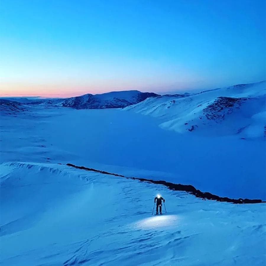 Da vi startet på natta var det minus 18 kuldegrader på Bessheim, men vi gikk oss raskt varme. Etter drøye to timer i mørket nådde vi turens første fjell, Besshøe (2258 moh.). Her fikk vi en fantastisk soloppgang over Jotunheimen.