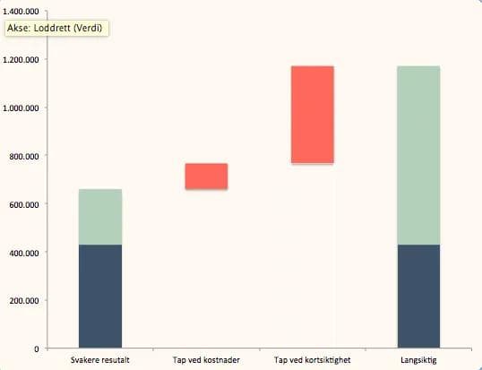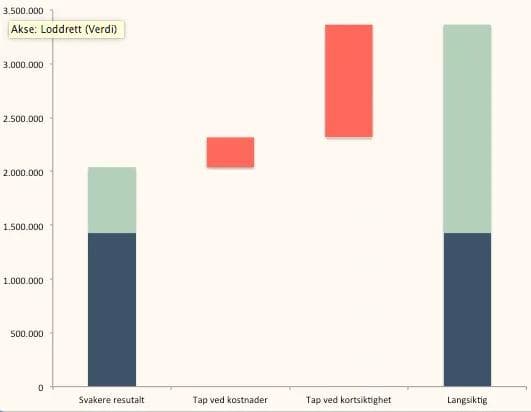 Søylediagrammet viser at Ola vil få rundt 3,4 millioner kroner utbetalt over en periode på ti år hvis han er langsiktig og passer på pensjonen sin. Hvis han blir utsatt for aggressiv nedtrapping kan han tape så mye som én million kroner. Et høyt kostnadsnivå koster rundt 300 000 kroner for mye. Ola vil sitte igjen med en pensjon på like over 2 millioner kroner.