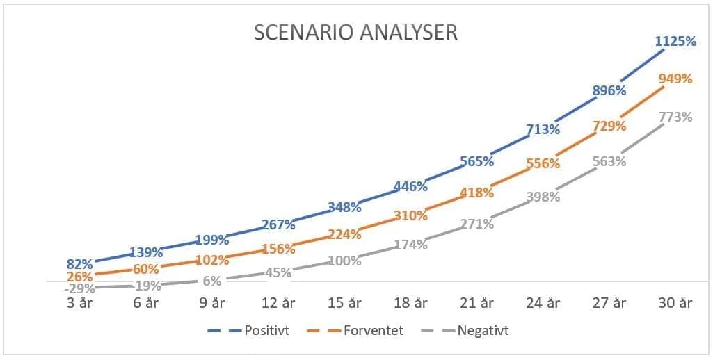 Som man ser av scenario-analysen er det store forskjeller i utfallsrommet mellom positivt og negativt scenario. Vår anbefaling er derfor å være konservativ i hvilken avkastning du forventer, ellers kan du både bli skuffet og få problemer om du er uheldig.