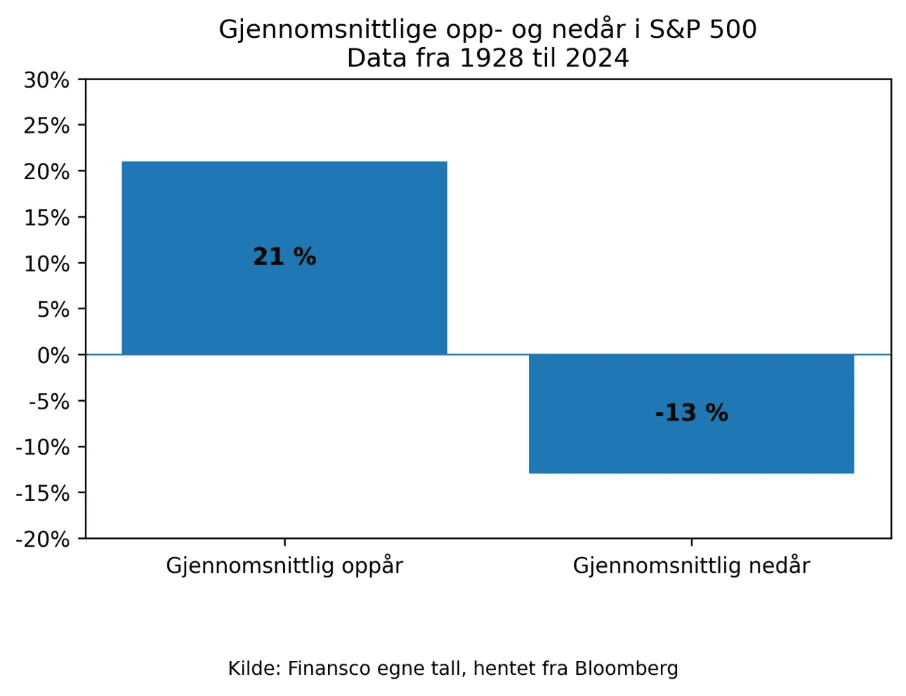 Ser vi helt tilbake til 1928, har det gjennomsnittlige fallet fra topp til bunn i et kalenderår vært rundt 16 prosent, målt ved S&P 500. Det er mer enn mange intuitivt forventer. Når jeg snakker med kunder og nevner dette tallet, blir de fleste oppriktig overrasket: Er det virkelig så store fall i løpet av ett enkelt år?