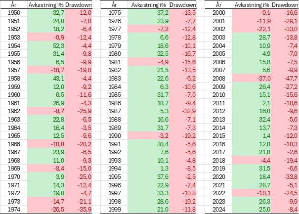 Tabellen under viser årlig avkastning i S&P 500 siden 1950, samt det største fallet fra topp til bunn i hvert kalenderår. Den illustrerer et viktig poeng: De fleste år i aksjemarkedet ender positivt, selv om veien dit ofte innebærer betydelige svingninger underveis.