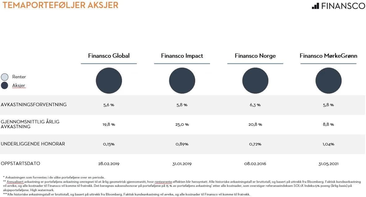 *Finansco Global fra 28. feb. 2019. Finansco Impact fra 31. jan. 2019. Finansco Norge fra 8. feb. 2016. Finansco MørkeGrønn fra 31. mai 2021.**Avkastning er inkludert suksessfee, men årlig forvaltningshonorar (0,75 %-1,65 % p.a.) kommer til fratrekk.