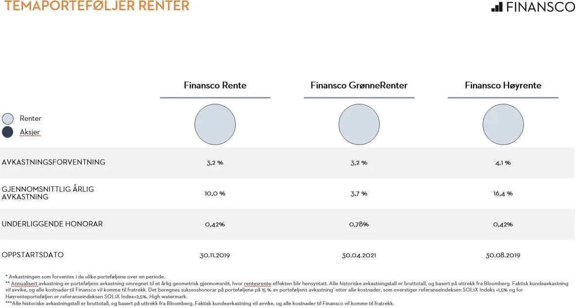 *Finansco Rente fra 30. november. 2019. Finansco Høyrente fra 30. august 2019. Finansco GrønneRenter fra 30. april. 2021.**Avkastning er inkludert suksessfee, men årlig forvaltningshonorar (0,75 %-1,65 % p.a.) kommer til fratrekk.