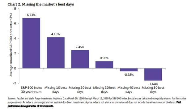 I en nylig publisert rapport fra Wells Fargo fant jeg en oppdatert versjon av følgende analyse: Hvilken avkastning – eller mangel på sådan – en fondssparer oppnår hvis man mister noen av de beste dagene i aksjemarkedet. Grafen kan du se under. Dette er tall fra USA, og den viser hvor mye avkastningen faller dersom man mister de beste dagene.