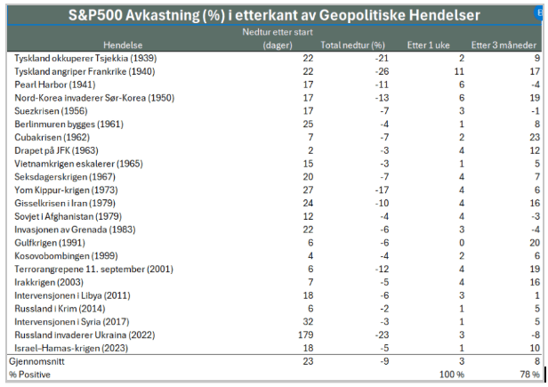 Grafen viser at børsfall i etterkant av geopolitiske sjokk ofte er relativt moderate og kortvarige. I gjennomsnitt har markedet falt rundt 9 prosent fra topp til bunn, men allerede etter én uke er avkastningen gjennomgående positiv, og etter tre måneder har markedet steget i majoriteten av tilfellene. Dette understreker at markedsuro knyttet til geopolitikk historisk sett sjelden har gitt varige negative utslag for langsiktige investorer.