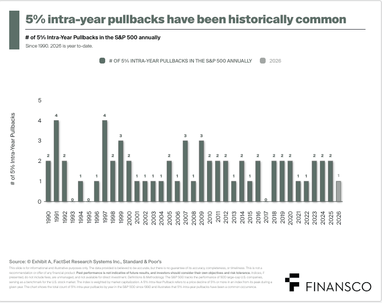 Aksjemarkedet har historisk vist en robust evne til å håndtere uro. Korreksjoner på 5 prosent eller mer inntreffer jevnlig, ofte flere ganger i løpet av et år, uten at det hindrer god avkastning over tid. Slike fall er en naturlig del av markedsdynamikken – ikke et tegn på at noe fundamentalt nødvendigvis er galt.