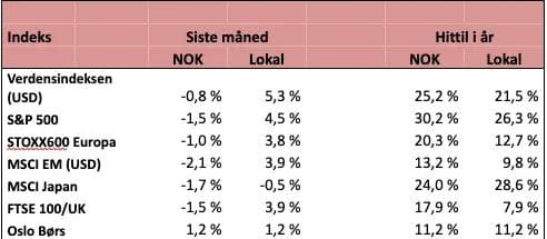 I desember var de ulike aksjemarkedene jeg følger fra ned 0,5 % til opp 5,4 % i lokal valuta. Av regionale aksjemarkeder var fremvoksende markeder svakest, mens USA var sterkest, målt ved S&P 500. Som følge av en rask kronestyrkelse etter Norges Banks ganske overraskende rentehevelse i desember ble avkastningen målt i NOK negativt, med unntak av Oslo Børs.