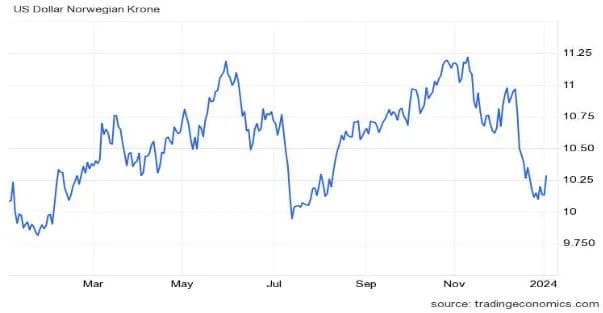 Svakest i NOK ble fremvoksende markeder, og best var naturlig nok Oslo Børs. Når jeg ser hva de ulike valutastrategene har av forventning for 2024, for eksempelvis USD mot NOK, så varierer anslagene med hele 2,5 NOK, fra 9,50 NOK til 12,00 NOK. Et sjeldent stort utfallsrom fra valutaekspertene.