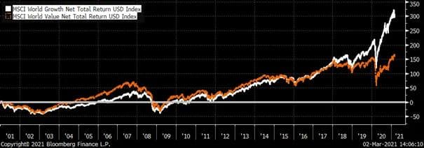 Deler vi verdens aksjer i henholdsvis vekstaksjer og verdiaksjer, vil man se at i perioder vil den ene gruppen gi bedre avkastning enn den andre, om omvendt. Det handler som regel om at den relative prisingsforskjellen blir så stor at markedsaktørene korrigerer dette gjennom å selge det som er dyrt og kjøpe det som er billig. Grafen under viser den samlede avkastningen for henholdsvis globale vekst- og verdiaksjer siden 2000 og illustrerer dette tydelig. De siste 3-4 årene har imidlertid vært helt utenfor normalen, hvor vekstaksjer har blitt stadig dyrere i forhold til verdiaksjer, uten at markedene har vist tegn til den tradisjonelle normalisering av avkastning og prising. Jeg tror en vesentlig årsak til denne utviklingen har vært korte og lange renter som har falt helt ned til 0 og sågar til negative renter i den samme perioden. Vekstselskaper, som ofte har sin inntjening lengre frem i tid, har nytt godt av at diskonteringsrenten for fremtidig inntjening har beveget ned til bortimot 0 %. Verdiaksjer har ikke fått den samme effekten da de har mer av inntjeningen nærmere i tid.