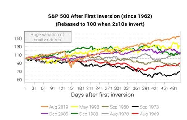 Et helt annet spørsmål er hva aksjemarkedene gjør etter en invertering av rentekurven. Enda en gang kan vi vende oss til Variant Perceptions grafer, og under viser jeg en sammenligning mellom de åtte gangene rentekurven har invertert siden 1962, og hvilken avkastning SP500 har gitt de neste par årene.
