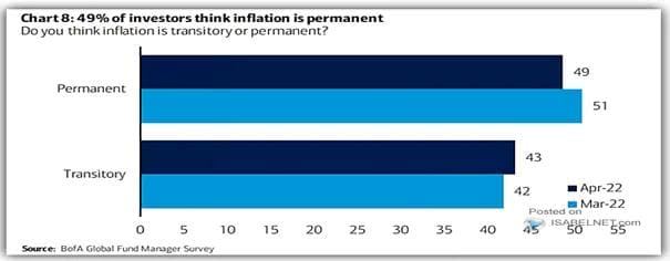 Grafen under er i så måte ikke så hyggelig å studere. Bank of America har gjennomført en spørreundersøkelse blant globale fondsforvaltere om disse tror at høyere inflasjon er kommet for å bli, eller om den er forbigående. Omtrent 50 % av de spurte tror nå at inflasjonsnivået fremover vil være permanent høyere. Trøbbel i gjære?