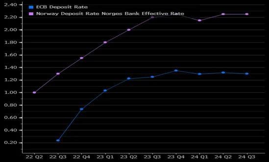 Forventningene for hvor høyt sentralbankrentene skal opp i henholdsvis Europa og Norge vises i neste graf. For ECB og Norges Bank sin del ligger heldigvis forventningene klart lavere. Dette er signaler som ikke burde bekymre noen om det skulle slå til.