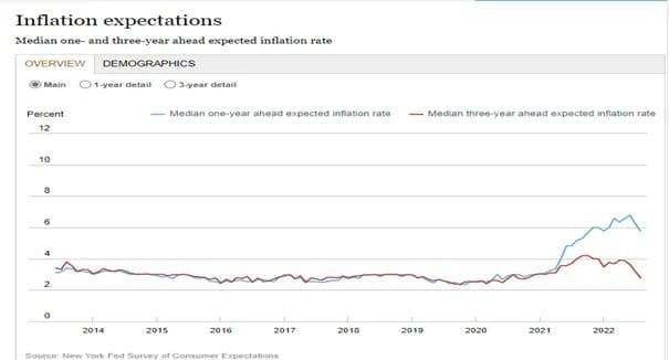 Ser vi på hva konsumentenes inflasjonsforventninger i USA er på henholdsvis ett år og tre års sikt, ser vi at de faller, men kanskje ikke så raskt som håpet.