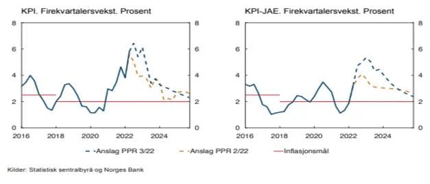 For Norge har jeg ikke tilsvarende forventningstall på fremtidig inflasjon som i USA. Norges Bank offentliggjør imidlertid i sine Pengepolitiske rapporter hvilken fremtidig inflasjonsutvikling de forventer seg. Dette vises i grafene under. Her fremgår det tydelig, og i tråd med øvrige «værvarsel», at det kommer til å ta en god stund før inflasjonen igjen kommer ned på nivåer vi har vært vant med tidligere.