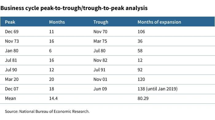 Som vanlig går jeg til amerikanske kilder, fordi her finnes det mest data, best data og lengst historikk. Den første tabellen jeg henviser til under, viser lengden på de identifiserte resesjonene de siste 50 årene. I snitt varer de omtrent et år, men variasjonene er store. Etter syv magre kommer heldigvis syv fete, og når regnværet har gitt seg, stikker solen alltid seg frem igjen. I etterkant av en resesjon ser vi at oppgangsperiodene varer i gjennomsnitt 6-7 år.