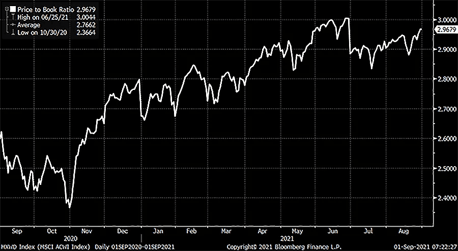Graf 3: Endring i P/B for Verdensindeksen (MSCI World ACWI) siste 12 mnd.