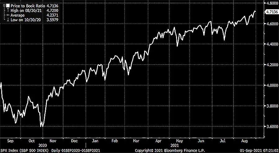 Oslo Børs har nå en P/B på 2,1 sammenlignet med et historisk gjennomsnitt1) P/B på 1,7. For den amerikanske aksjeindeksen S&P500 er P/B nå på 4,7 sammenlignet med et historisk gjennomsnitt* P/B på 2,9. Den brede aksjeindeksen MCSI World ACWI har en P/B på 3,0 mot et historisk gjennomsnitt* på 2,3.