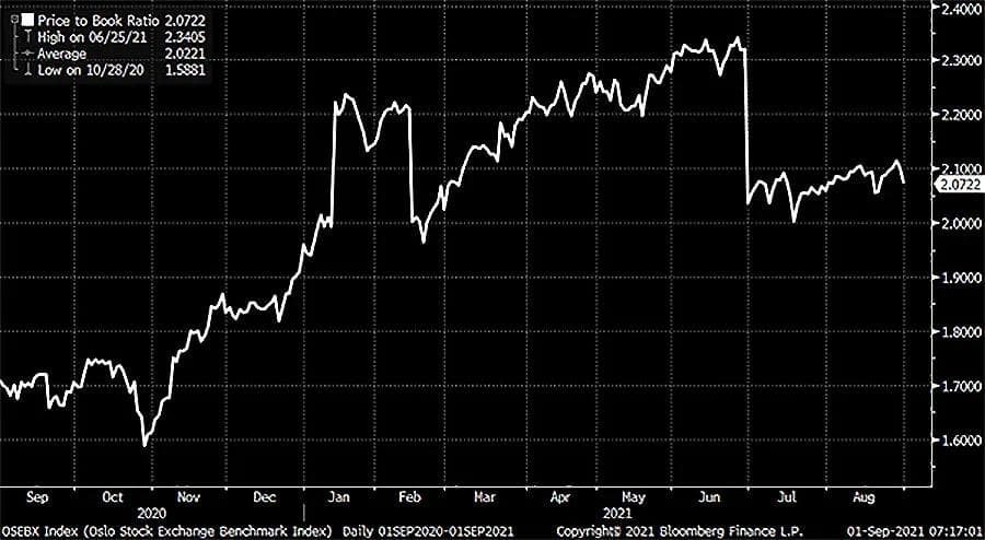 Er man ute etter et prisingstall på dagens markedssituasjon isolert sett er vel kanskje P/E mest spennende å se på. For da ser man hva implisitt earnings yield er – altså hva selskapenes fundamentale verdiskapning er – i forhold til sin markedspris. P/B kan jo brukes det også, men å vite at et selskap for eksempel er priset til 2,1 ganger sin bokverdi forteller jo ikke mye om avkastningspotensialet fremover. Ikke før man kan sammenligne det historisk.
