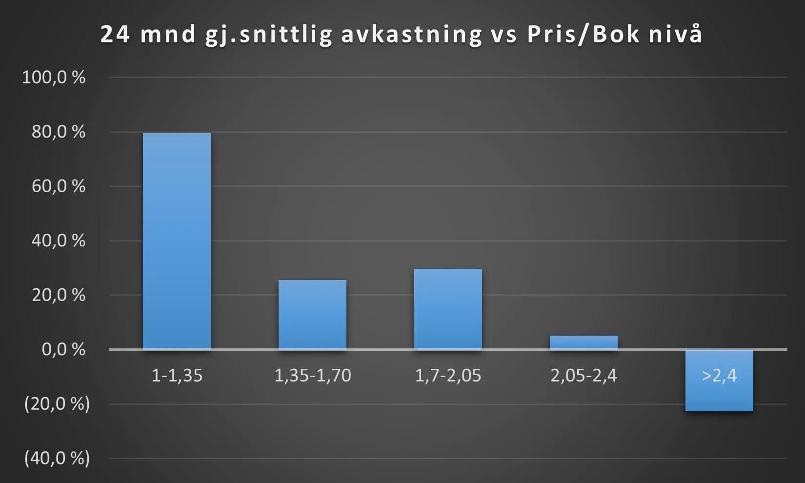 En annen, og kanskje litt mer pedagogisk måte å illustrere sammenhengen mellom prising og avkastning, vises i grafen under. Her ser man over 24 måneder den gjennomsnittlige avkastningen for ulike Pris/Bok-intervaller, fra lavest til høyest Pris/Bok-nivå.