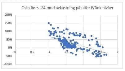 Den første grafen under viser sammenhengen mellom Pris/Bok-nivået på et gitt tidspunkt og hvilken avkastning en investering på det prisingsnivået ville ha gitt etter 2 år.